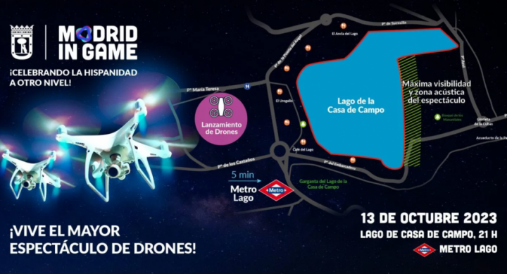 Pero quizás uno de los espectáculos más esperados será la exhibición aérea de luz y sonido realizada con drones. Será el día 13, a las 21.00 horas, en las inmediaciones de la casa de Campo. Durante 10 minutos, se recrearán imágenes e iconos de la ciudad de Madrid a través a través de una coreografía repleta de dinamismo.